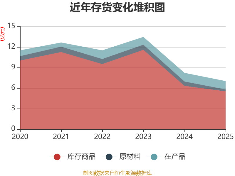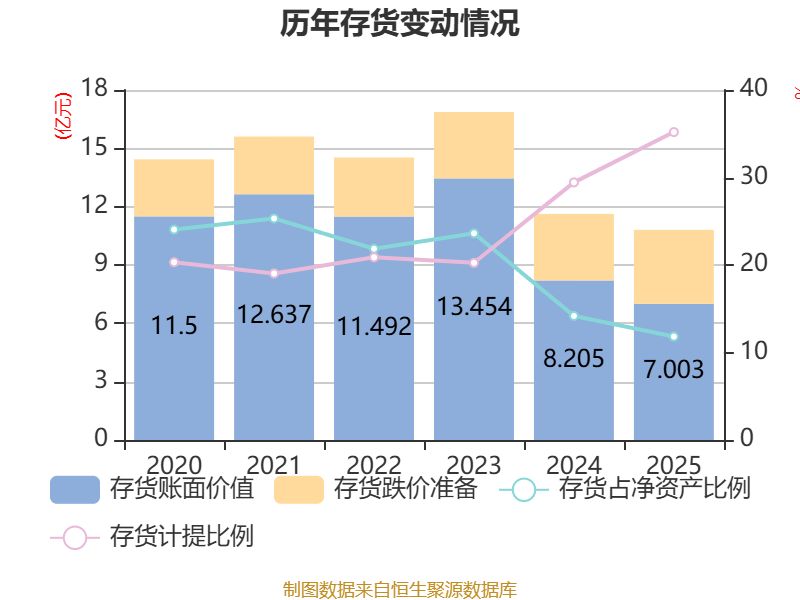 从存货变动来看,截至2025年末,公司存货账面价值为7亿元,占净资产的11.82%,较上年末减少1.2亿元。其中,存货跌价准备为3.8亿元,计提比例为35.19%。