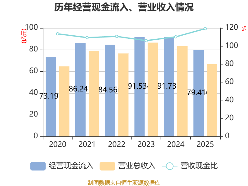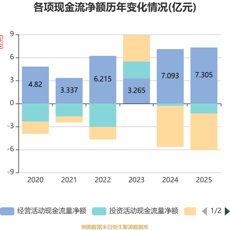 截至2025年,公司经营活动现金流净额为7.3亿元,同比增长2.98%;筹资活动现金流净额-4.76亿元,同比增加6044万元;投资活动现金流净额-1.31亿元,上年同期为-2961.64万元。