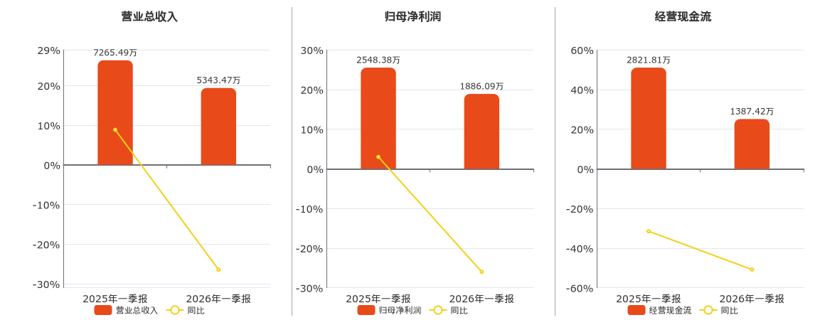 公司营业总收入为5343.47万元,较去年同报告期营业总收入减少1922.02万元,同比较去年同期下降26.45%。归母净利润为1886.09万元,较去年同报告期归母净利润减少662.29万元,同比较去年同期下降25.99%。经营活动现金净流入为1387.42万元,较去年同报告期经营活动现金净流入减少1434.39万元,同比较去年同期下降50.83%。