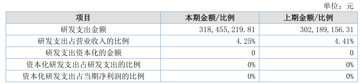 2025年全年,公司研发投入金额为3.18亿元,同比增长5.38%;研发投入占营业收入比例为4.25%,相比上年同期下降0.16个百分点。此外,公司全年研发投入资本化率为0%。