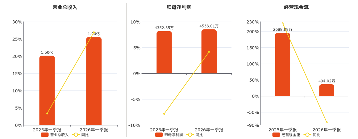 公司营业总收入为1.90亿元。归母净利润为4533.01万元。经营活动现金净流入为494.02万元,较去年同报告期经营活动现金净流入减少2194.87万元,同比较去年同期下降81.63%。