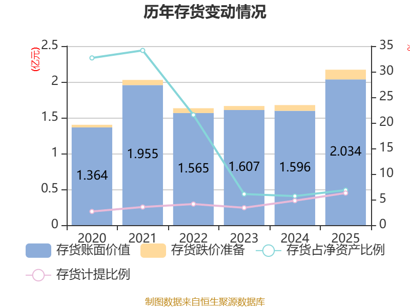 从存货变动来看,截至2025年末,公司存货账面价值为2.03亿元,占净资产的6.85%,较上年末增加4381.67万元。其中,存货跌价准备为1359.71万元,计提比例为6.27%。