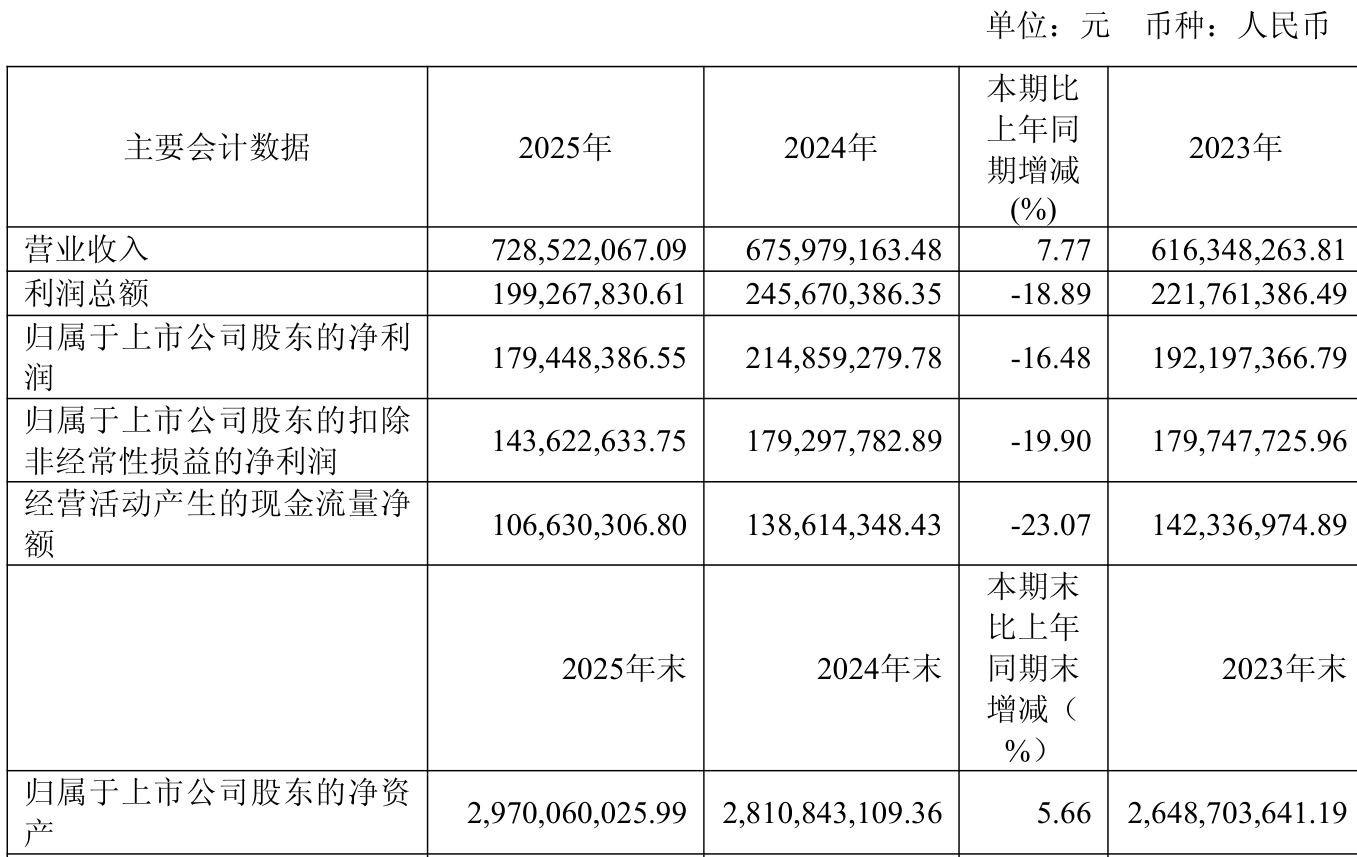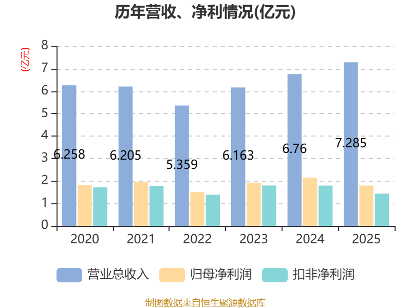 中证智能财讯众辰科技(603275)4月23日披露2025年年度报告。2025年,公司实现营业总收入7.29亿元,同比增长7.77%;归母净利润1.79亿元,同比下降16.48%;扣非净利润1.44亿元,同比下降19.90%;经营活动产生的现金流量净额为1.07亿元,同比下降23.07%;报告期内,众辰科技基本每股收益为1.21元,加权平均净资产收益率为6.19%。公司2025年度分配预案为:拟向全体股东每10股派现1.21元(含税)。