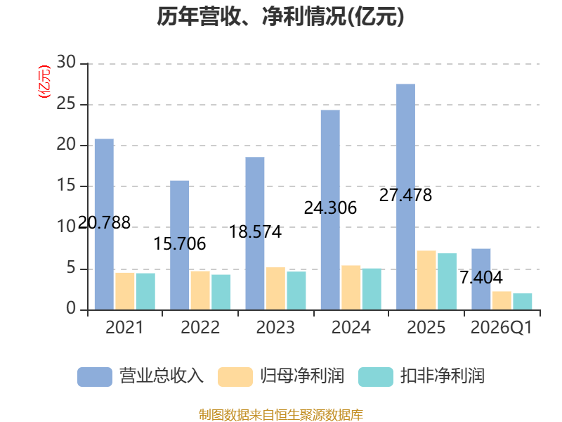中证智能财讯军信股份(301109)4月23日披露2026年第一季度报告。公司实现营业总收入7.4亿元,同比下降3.49%;归母净利润2.2亿元,同比增长27.09%;扣非净利润1.96亿元,同比增长18.72%;经营活动产生的现金流量净额为2.36亿元,同比增长59.17%;报告期内,军信股份基本每股收益为0.2793元,加权平均净资产收益率为2.81%。