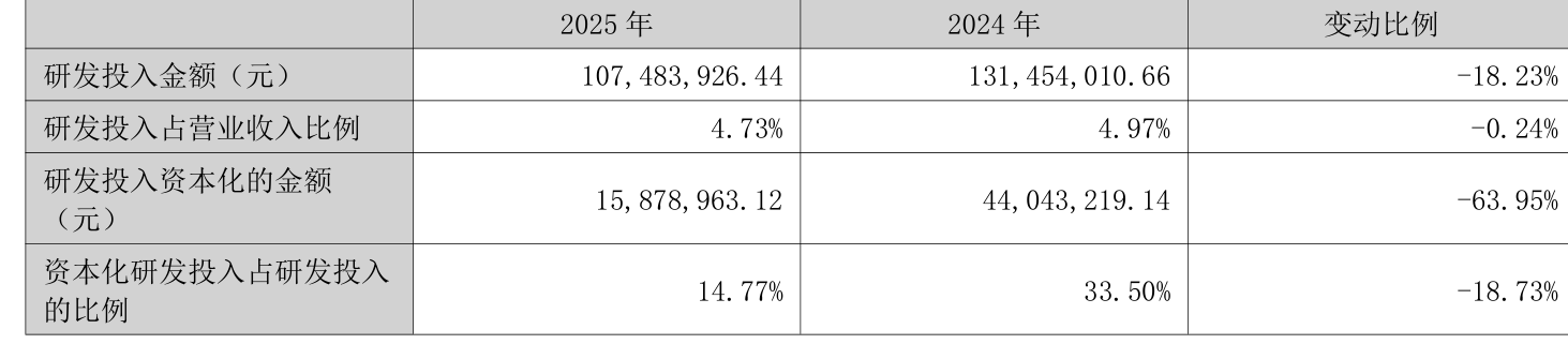 2025年全年,公司研发投入金额为1.07亿元,同比下降18.23%;研发投入占营业收入比例为4.73%,相比上年同期下降0.24个百分点。此外,公司全年研发投入资本化率为14.77%。