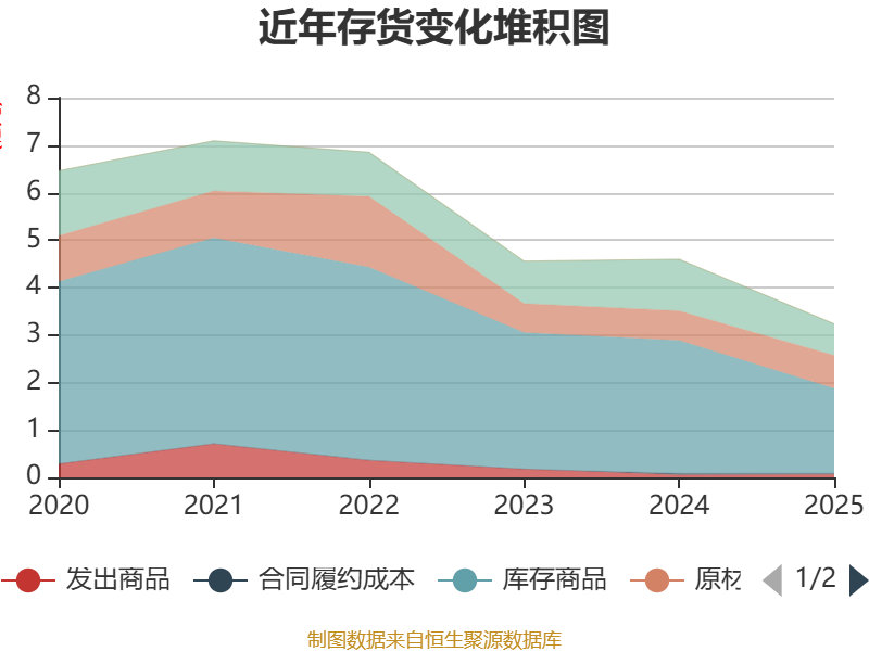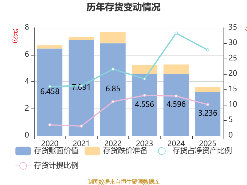 从存货变动来看,截至2025年末,公司存货账面价值为3.24亿元,占净资产的27.8%,较上年末减少1.36亿元。其中,存货跌价准备为3630.67万元,计提比例为10.09%。
