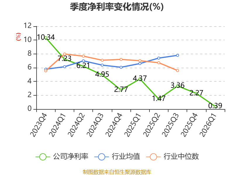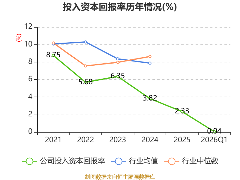 盈利能力方面, 2026年一季度公司加权平均净资产收益率为0.1%,同比下降0.95个百分点。公司2026年第一季度投入资本回报率为0.04%,较上年同期下降0.93个百分点。