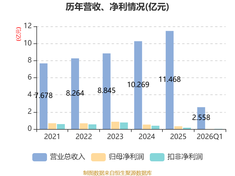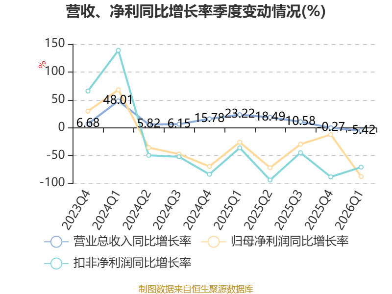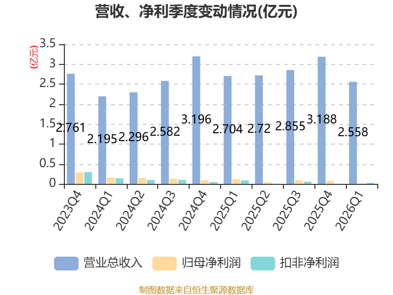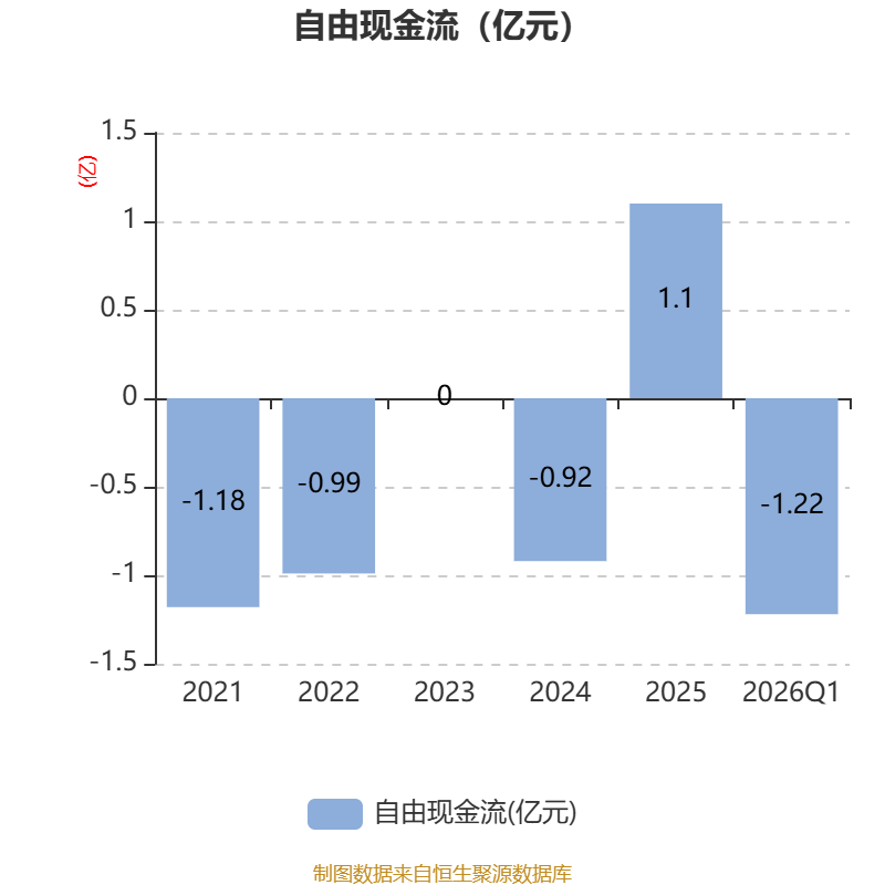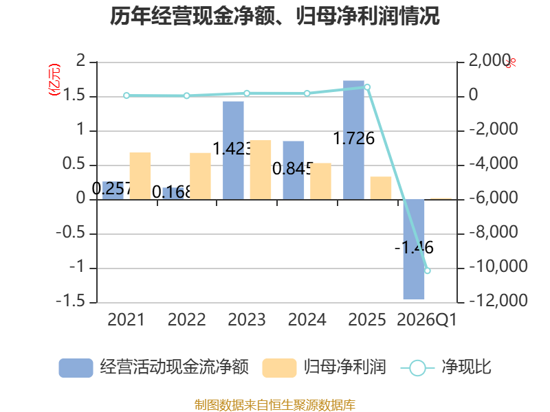 截至2026年一季度末,公司经营活动现金流净额为-1.46亿元,同比减少2.15亿元;筹资活动现金流净额1183.95万元,同比减少3636.66万元;投资活动现金流净额478.93万元,上年同期为-7304.06万元。