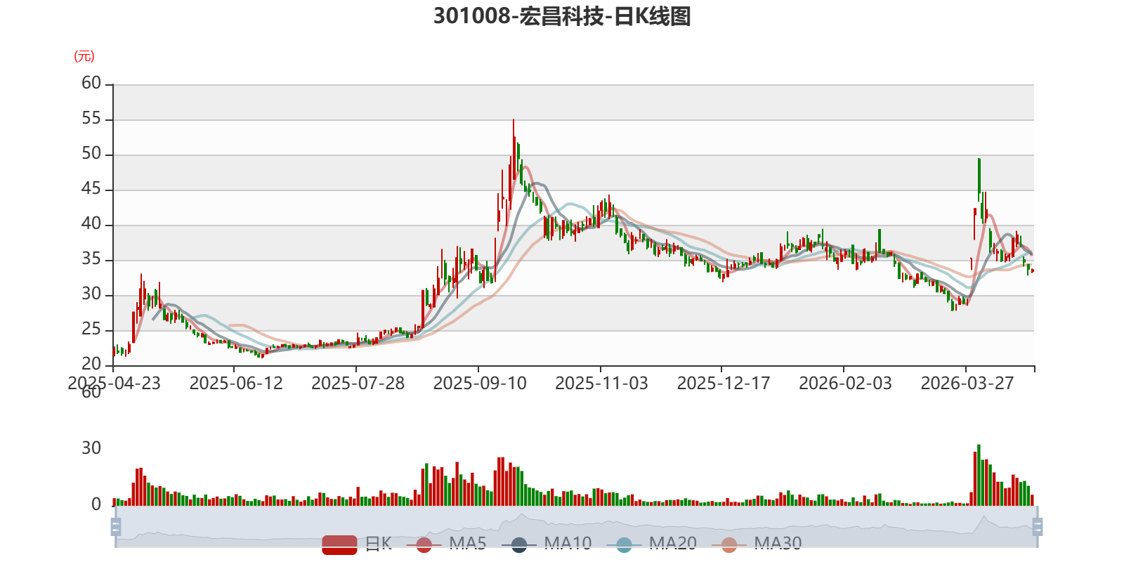 中证智能财讯宏昌科技(301008)4月23日披露2026年第一季度报告。公司实现营业总收入2.56亿元,同比下降5.42%;归母净利润143.62万元,同比下降87.96%;扣非净利润258.41万元,同比下降70.94%;经营活动产生的现金流量净额为-1.46亿元,上年同期为6861.02万元;报告期内,宏昌科技基本每股收益为0.0111元,加权平均净资产收益率为0.10%。
