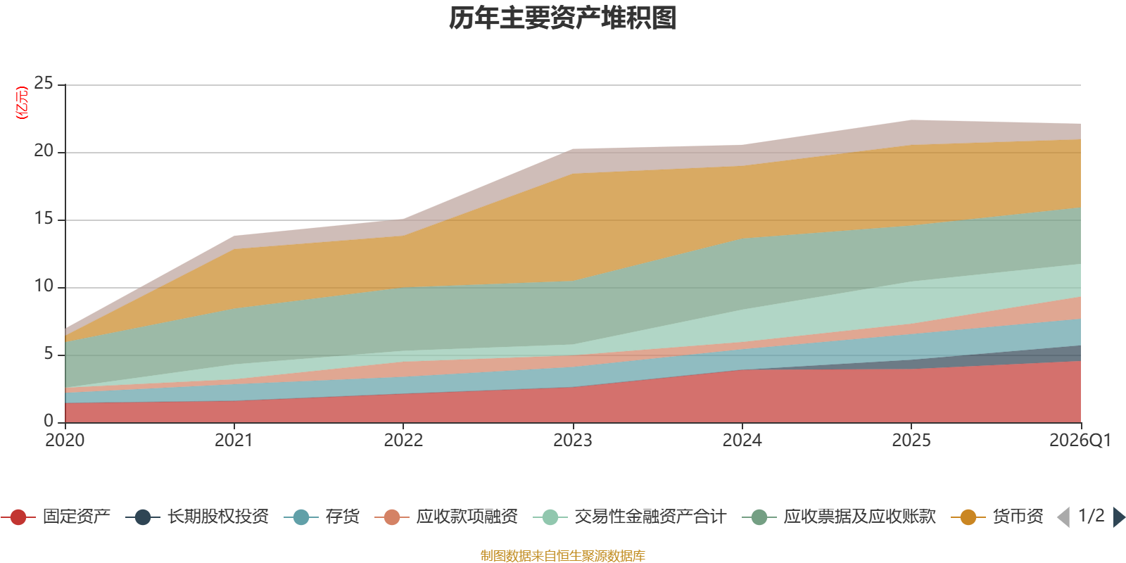 资产重大变化方面,截至2026年一季度末,公司应收款项融资较上年末增加115.58%,占公司总资产比重上升4.05个百分点;货币资金较上年末减少15.5%,占公司总资产比重下降3.83个百分点;在建工程合计较上年末减少94.88%,占公司总资产比重下降3.26个百分点;交易性金融资产合计较上年末减少22.67%,占公司总资产比重下降3.03个百分点。