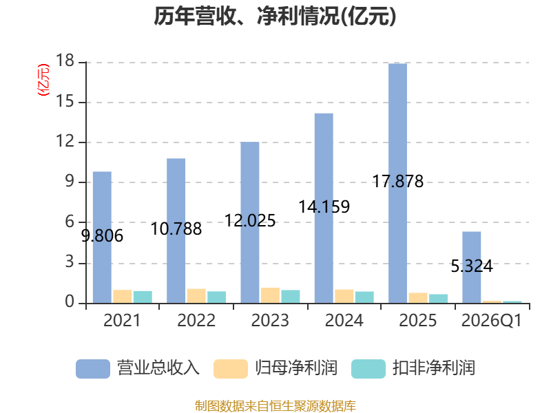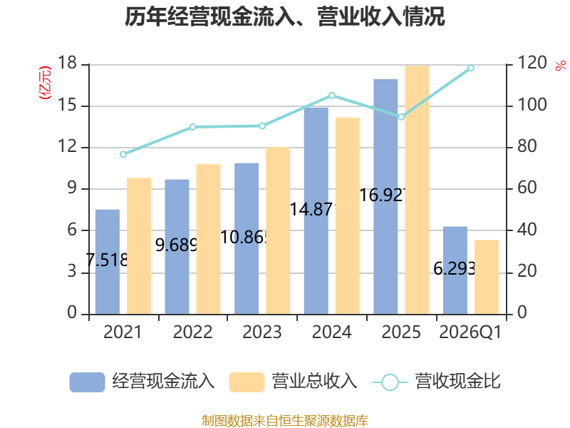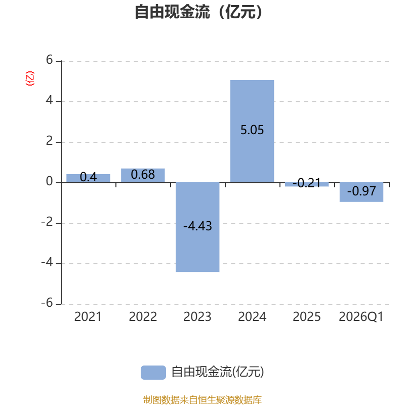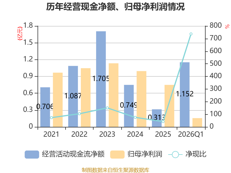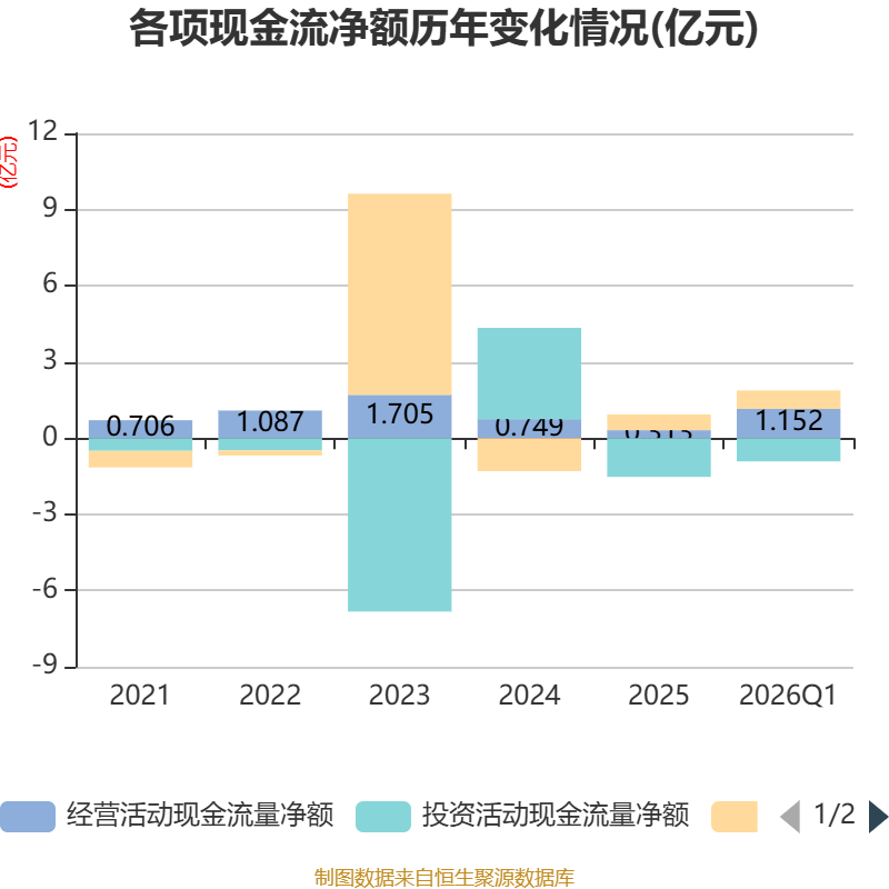 截至2026年一季度末,公司经营活动现金流净额为1.15亿元,同比增长142.72%;筹资活动现金流净额7260.14万元,同比增加7591.1万元;投资活动现金流净额-9152.38万元,上年同期为-7594.24万元。