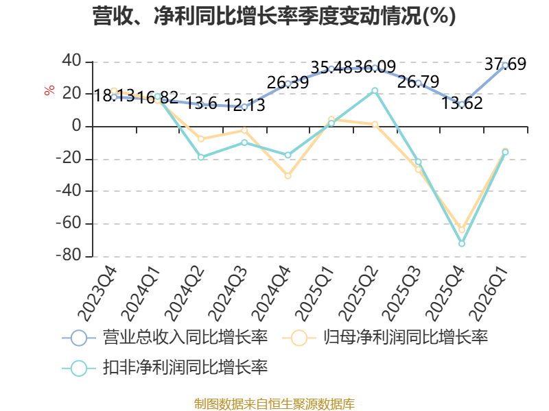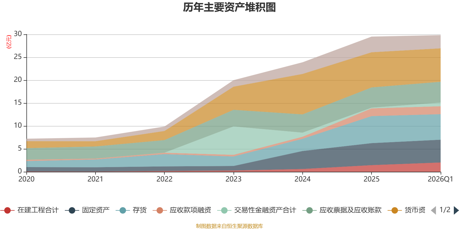 资产重大变化方面,截至2026年一季度末,公司交易性金融资产合计较上年末增加430.02%,占公司总资产比重上升2.18个百分点;在建工程合计较上年末增加40.61%,占公司总资产比重上升1.91个百分点;货币资金较上年末减少4.76%,占公司总资产比重下降1.5个百分点;其他非流动资产较上年末减少55.63%,占公司总资产比重下降1.42个百分点。