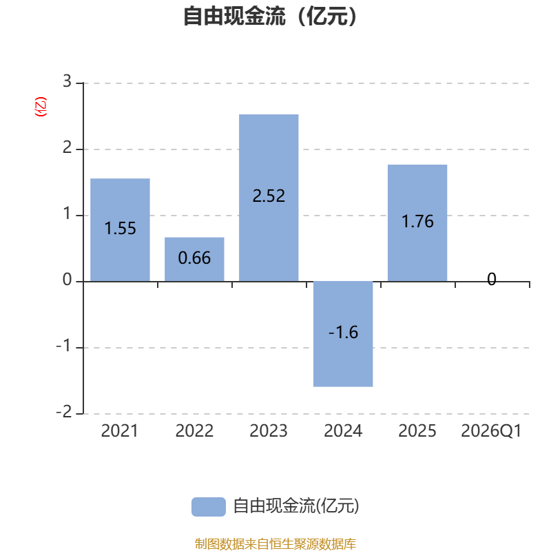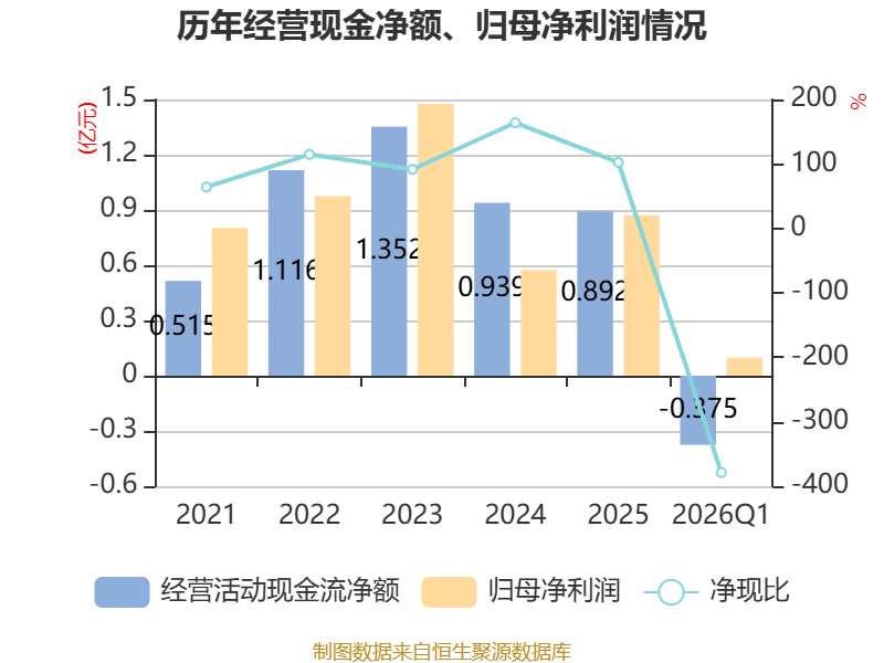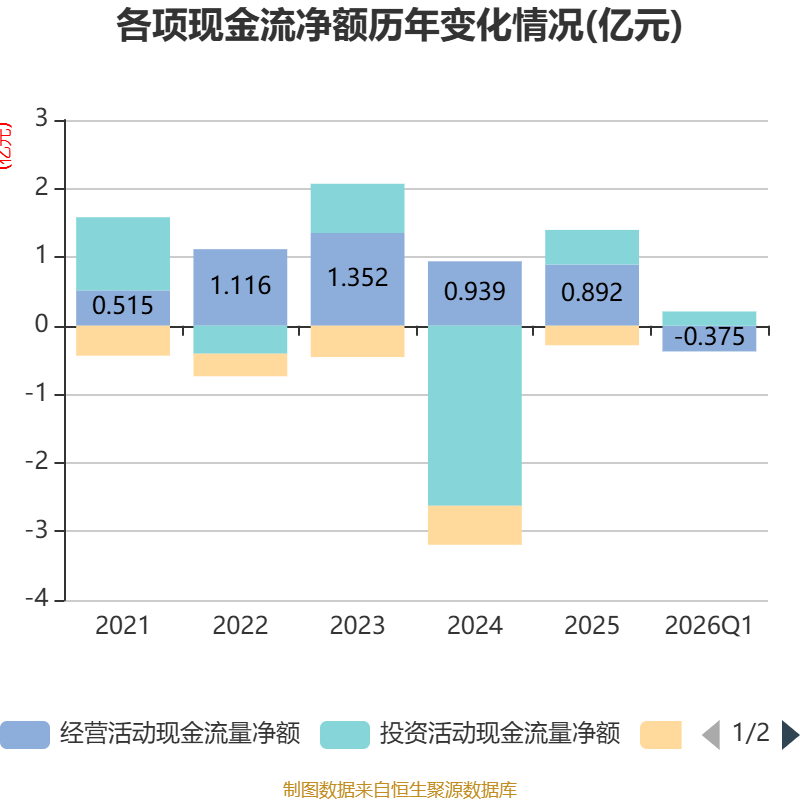 截至2026年一季度末,公司经营活动现金流净额为-3745.91万元,同比减少521.93万元;筹资活动现金流净额0元,与同期相比基本不变;投资活动现金流净额2080.27万元,上年同期为-1646.03万元。