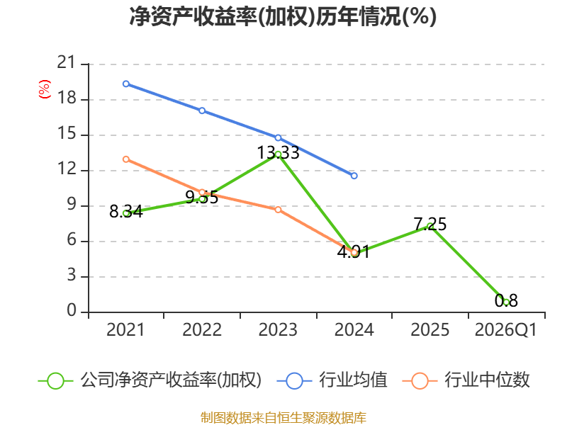 盈利能力方面, 2026年一季度公司加权平均净资产收益率为0.8%,同比下降1.11个百分点。公司2026年第一季度投入资本回报率为0.56%,较上年同期下降1.23个百分点。