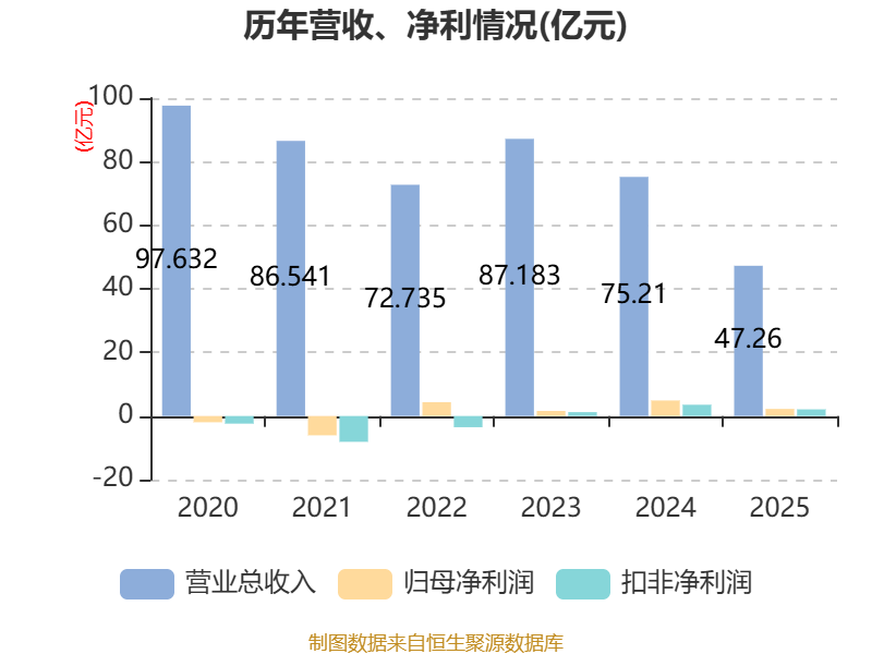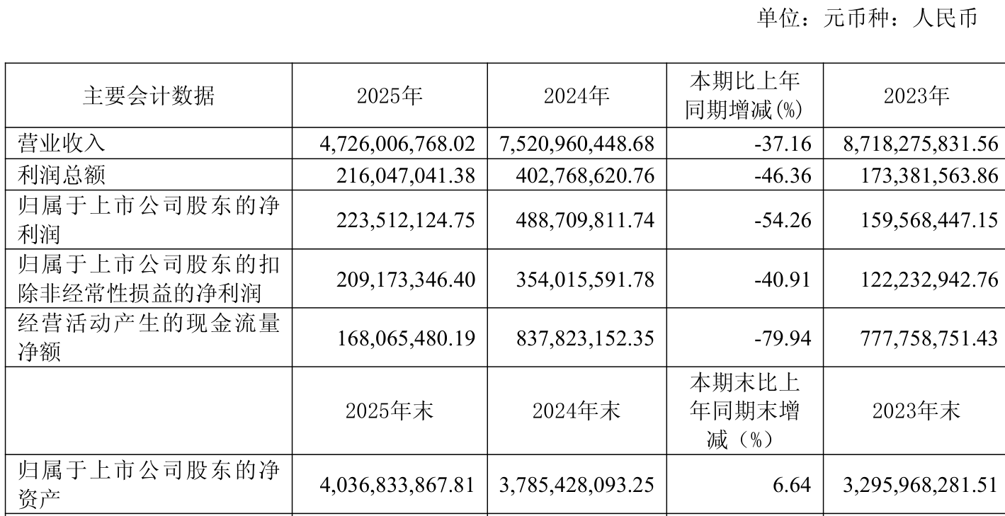 中证智能财讯华鼎股份(601113)4月23日披露2025年年度报告。2025年,公司实现营业总收入47.26亿元,同比下降37.16%;归母净利润2.24亿元,同比下降54.26%;扣非净利润2.09亿元,同比下降40.91%;经营活动产生的现金流量净额为1.68亿元,同比下降79.94%;报告期内,华鼎股份基本每股收益为0.2元,加权平均净资产收益率为5.74%。