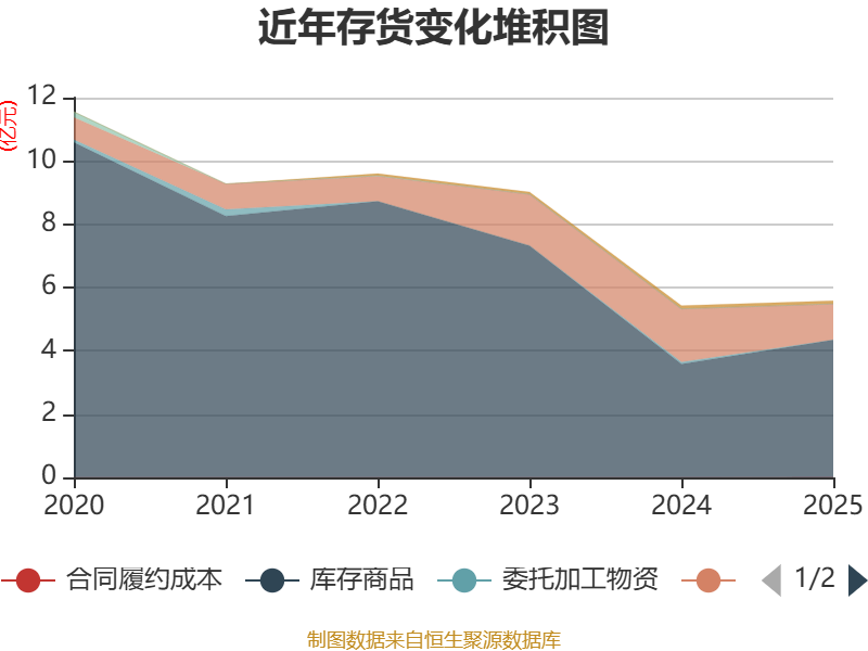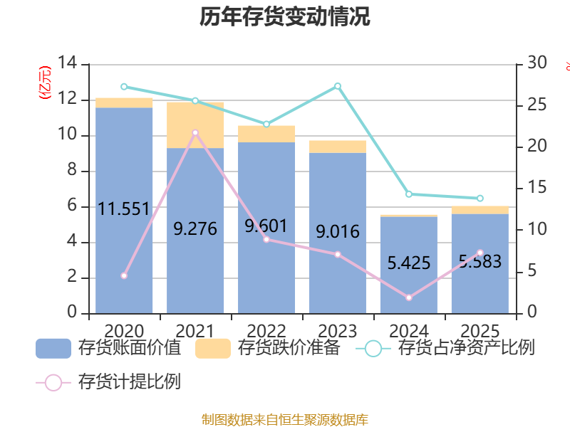 从存货变动来看,截至2025年末,公司存货账面价值为5.58亿元,占净资产的13.83%,较上年末增加1581.42万元。其中,存货跌价准备为4385.6万元,计提比例为7.28%。
