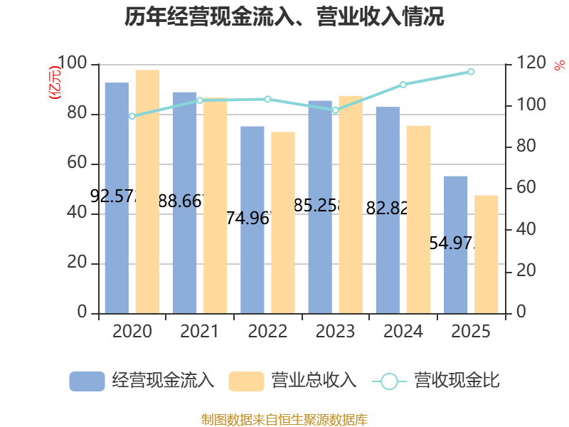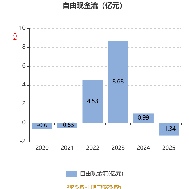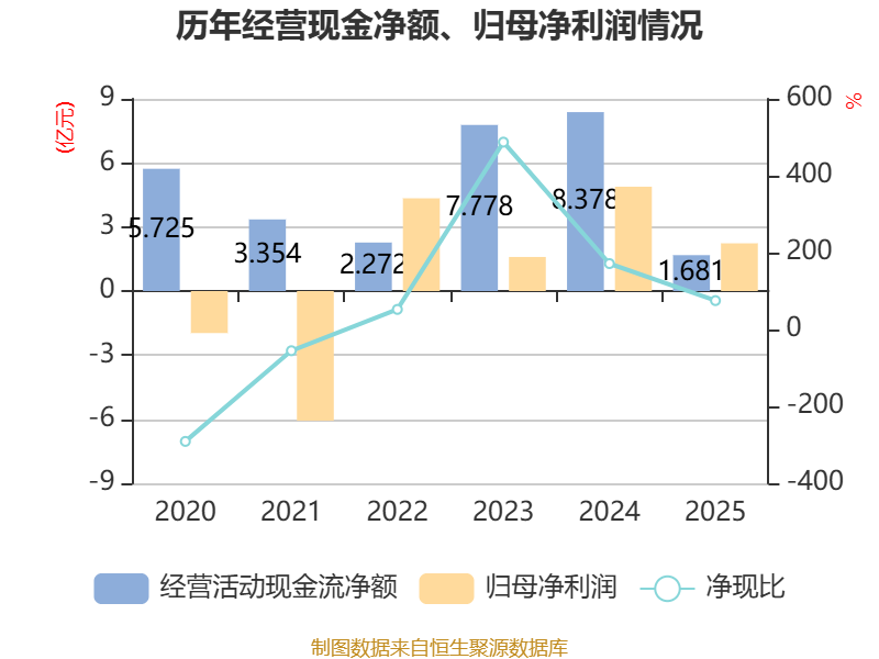 截至2025年,公司经营活动现金流净额为1.68亿元,同比下降79.94%;筹资活动现金流净额4.56亿元,同比增加9.87亿元;投资活动现金流净额-6.53亿元,上年同期为-10.72亿元。
