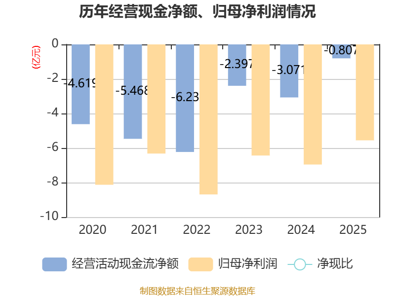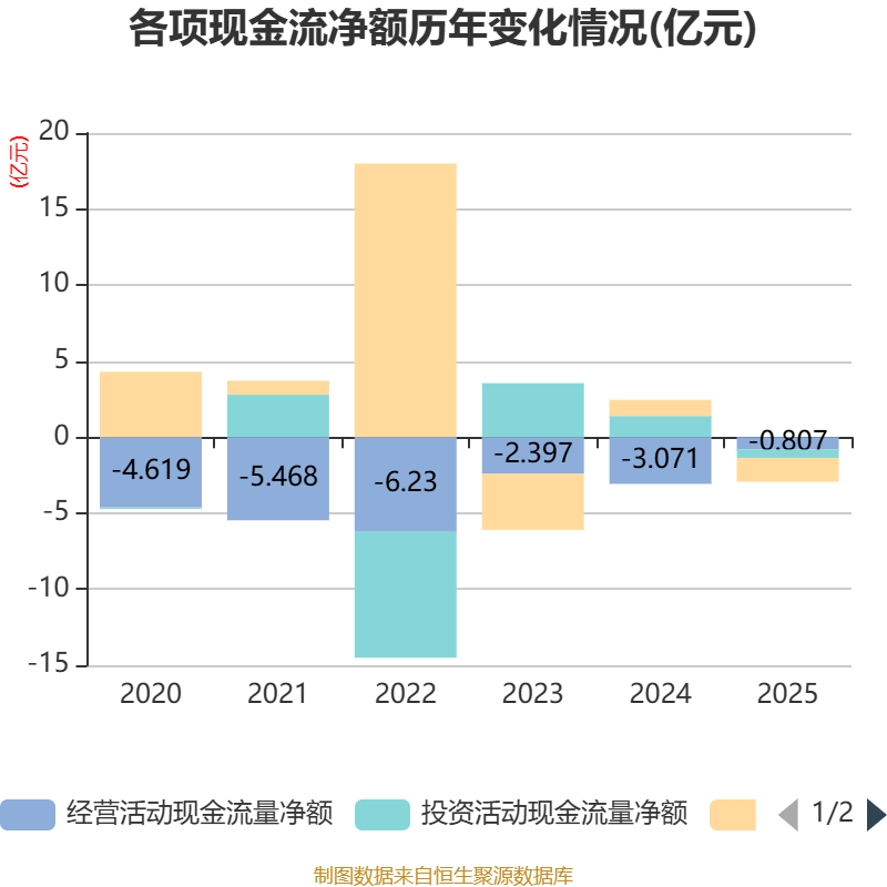 截至2025年,公司经营活动现金流净额为-8065.15万元,同比增加2.26亿元;筹资活动现金流净额-1.57亿元,同比减少2.63亿元;投资活动现金流净额-5535.91万元,上年同期为1.39亿元。