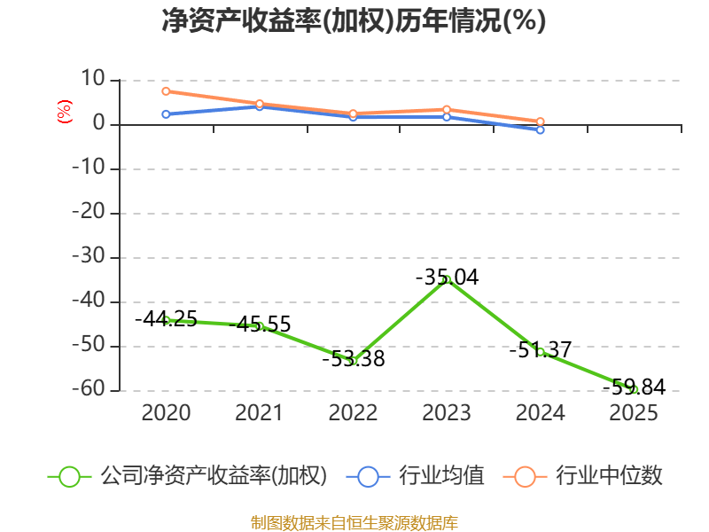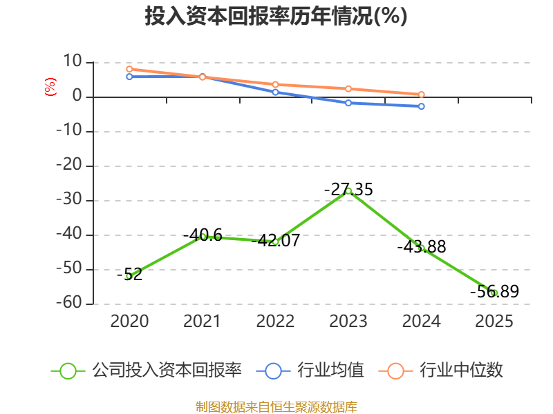 数据显示,2025年公司加权平均净资产收益率为-59.84%,较上年同期下降8.47个百分点。公司2025年投入资本回报率为-56.89%,较上年同期下降13.01个百分点。