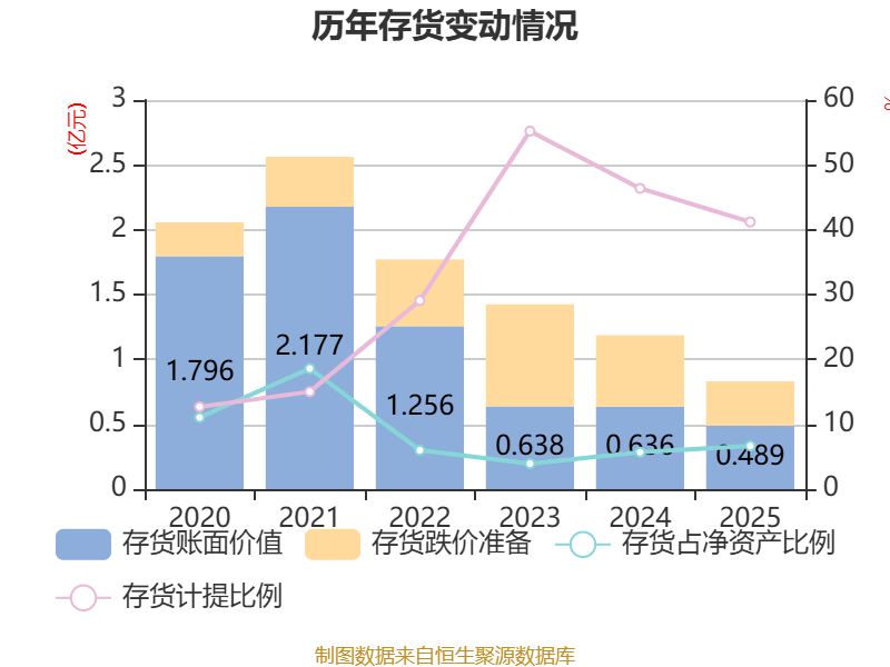 从存货变动来看,截至2025年末,公司存货账面价值为4886.57万元,占净资产的6.67%,较上年末减少1470.37万元。其中,存货跌价准备为3424.1万元,计提比例为41.2%。
