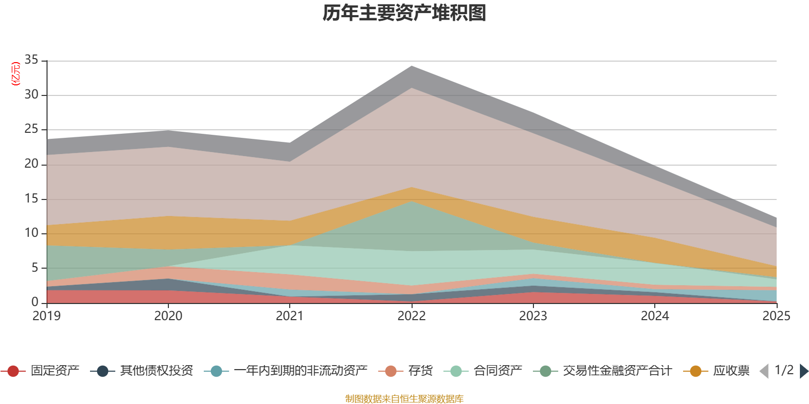 资产重大变化方面,截至2025年末,公司一年内到期的非流动资产较上年末增加276.39%,占公司总资产比重上升10.91个百分点;合同资产较上年末减少65.37%,占公司总资产比重下降7.03个百分点;应收票据及应收账款较上年末减少56.16%,占公司总资产比重下降5.38个百分点;固定资产较上年末减少77.86%,占公司总资产比重下降3.31个百分点。