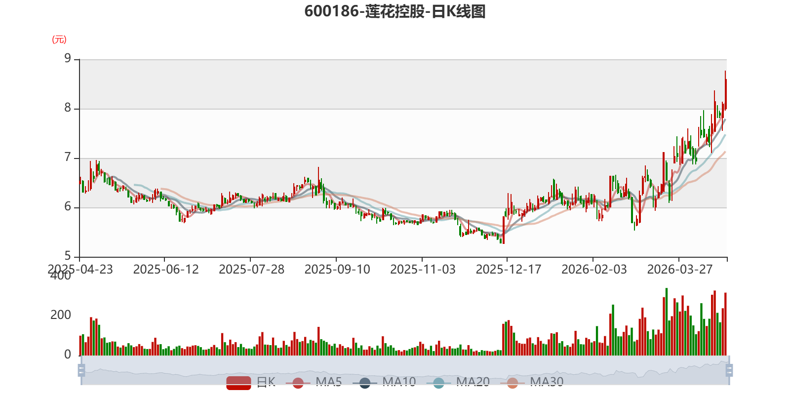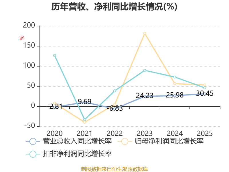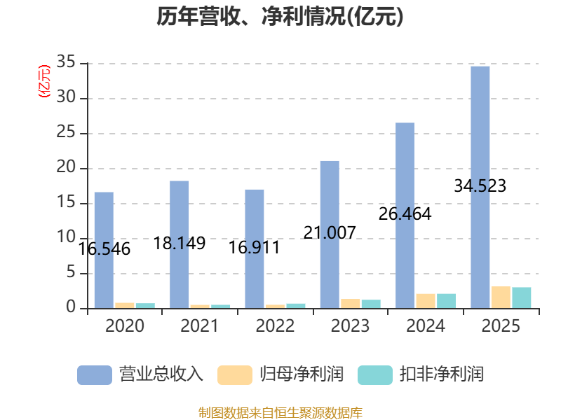 中证智能财讯莲花控股(600186)4月23日披露2025年年度报告。2025年,公司实现营业总收入34.52亿元,同比增长30.45%;归母净利润3.09亿元,同比增长52.59%;扣非净利润2.96亿元,同比增长45.42%;经营活动产生的现金流量净额为2.2亿元,同比下降66.23%;报告期内,莲花控股基本每股收益为0.18元,加权平均净资产收益率为16.99%。
