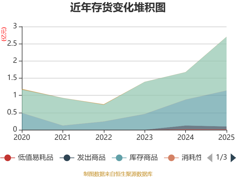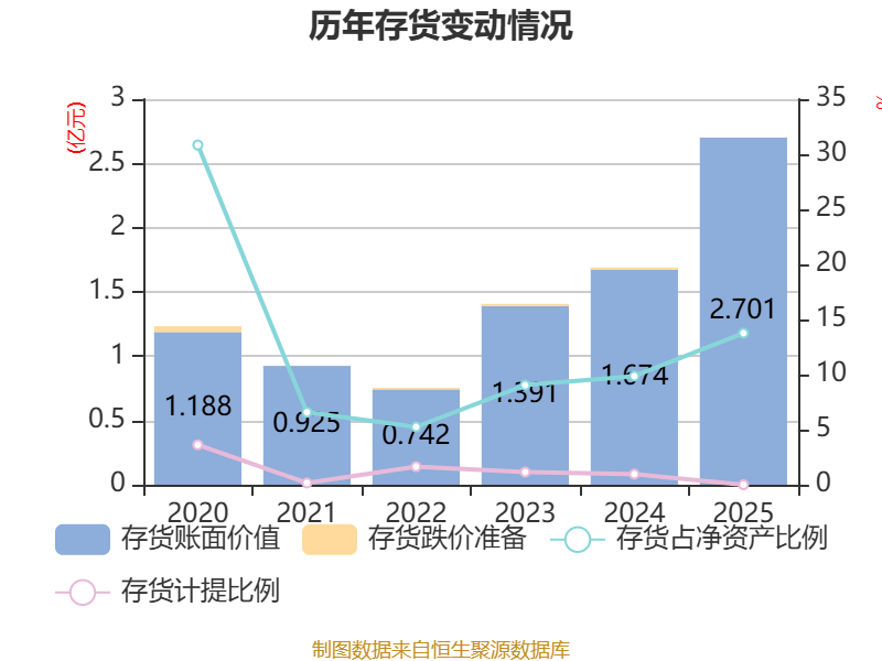 从存货变动来看,截至2025年末,公司存货账面价值为2.7亿元,占净资产的13.76%,较上年末增加1.03亿元。公司本期没有计提存货跌价准备。
