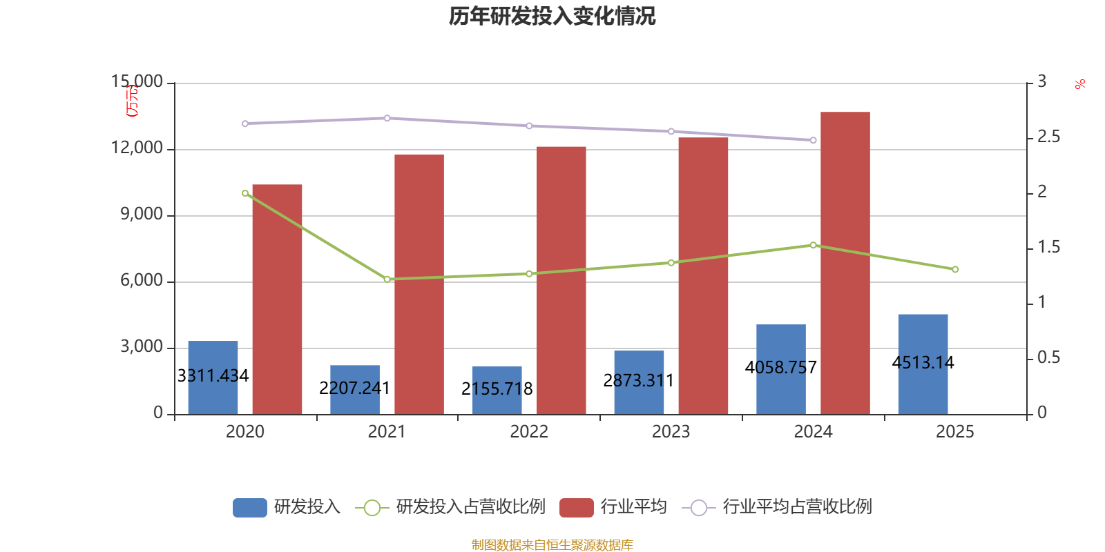 2025年全年,公司研发投入金额为4513.14万元,同比增长11.2%;研发投入占营业收入比例为1.31%,相比上年同期下降0.22个百分点。此外,公司全年研发投入资本化率为0%。