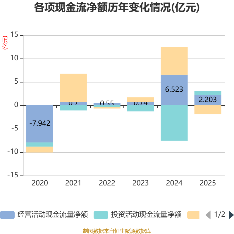 截至2025年,公司经营活动现金流净额为2.2亿元,同比下降66.23%;筹资活动现金流净额-1.9亿元,同比减少7.81亿元;投资活动现金流净额8158.7万元,上年同期为-7.55亿元。