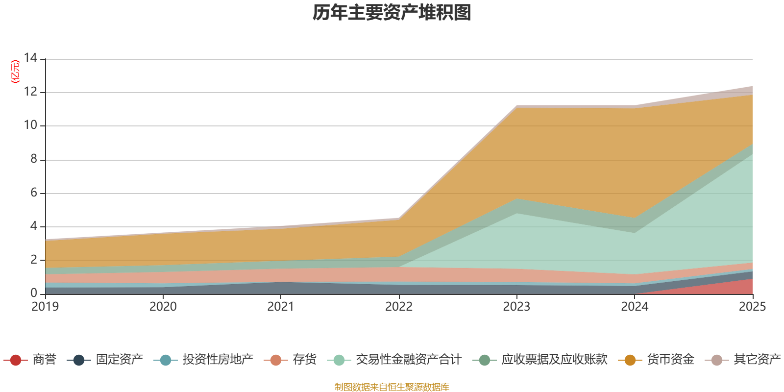 资产重大变化方面,截至2025年末,公司货币资金较上年末减少55.04%,占公司总资产比重下降34.34个百分点;交易性金融资产合计较上年末增加163.22%,占公司总资产比重上升30.32个百分点;商誉占公司总资产的7.28%,上年末为0;应收票据及应收账款较上年末减少33.25%,占公司总资产比重下降3.18个百分点。
