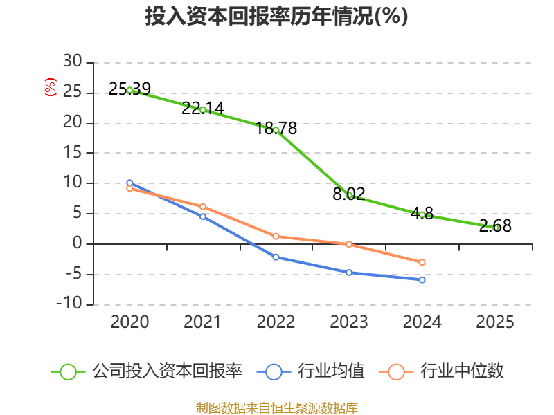 数据显示,2025年公司加权平均净资产收益率为2.81%,较上年同期下降2.26个百分点。公司2025年投入资本回报率为2.68%,较上年同期下降2.12个百分点。