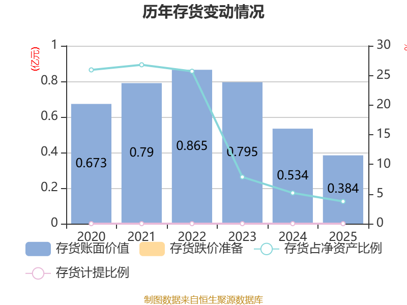 从存货变动来看,截至2025年末,公司存货账面价值为3840.61万元,占净资产的3.75%,较上年末减少1495.67万元。公司本期没有计提存货跌价准备。