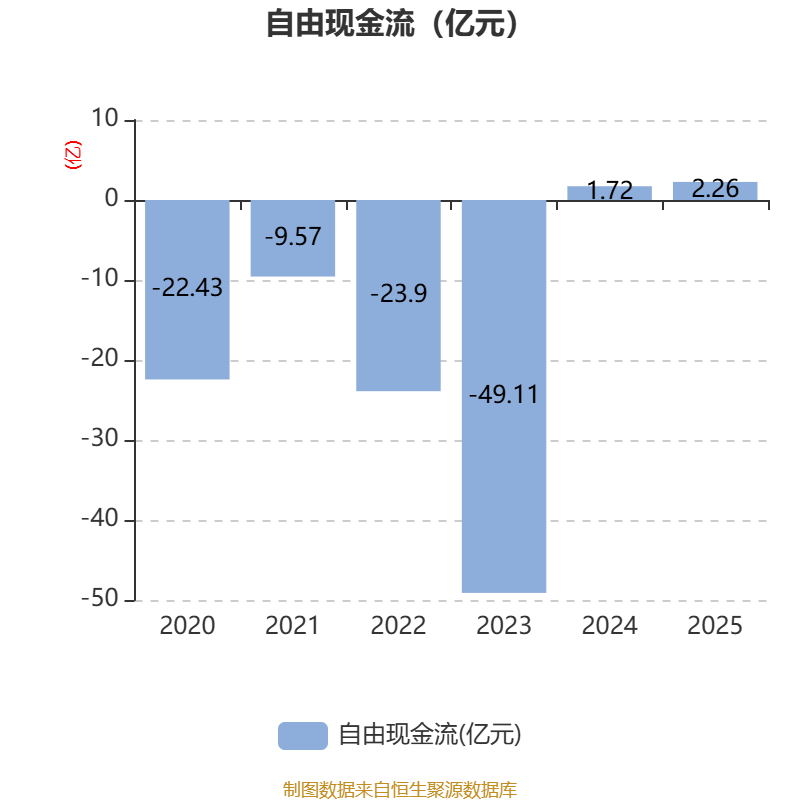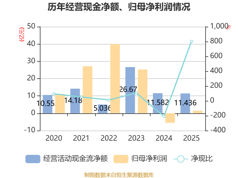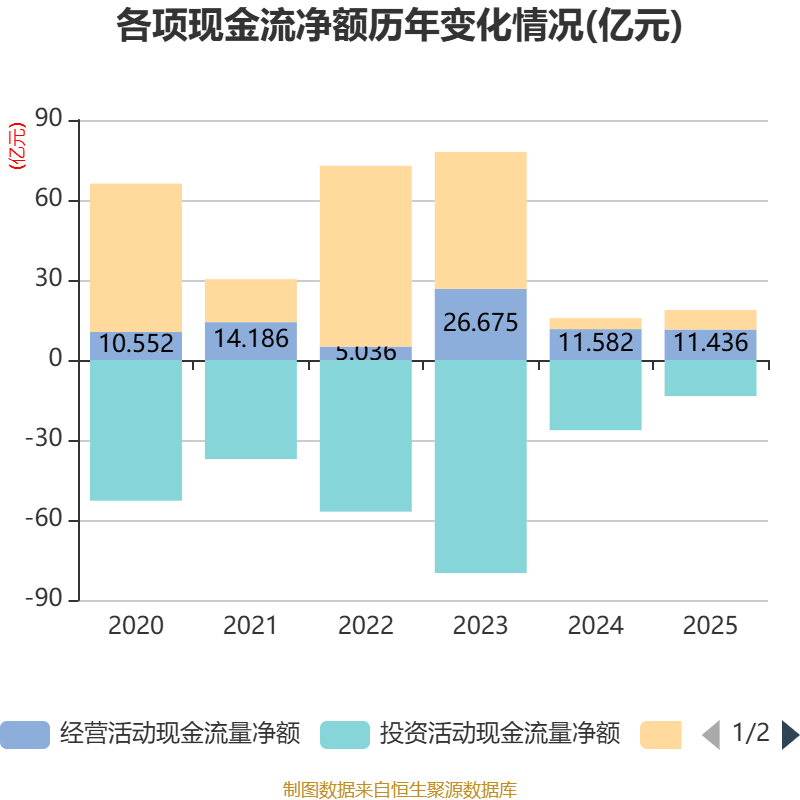 截至2025年,公司经营活动现金流净额为11.44亿元,同比下降1.26%;筹资活动现金流净额7.32亿元,同比增加3.19亿元;投资活动现金流净额-13.53亿元,上年同期为-26.32亿元。