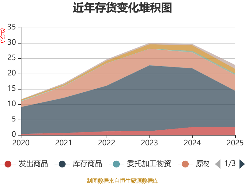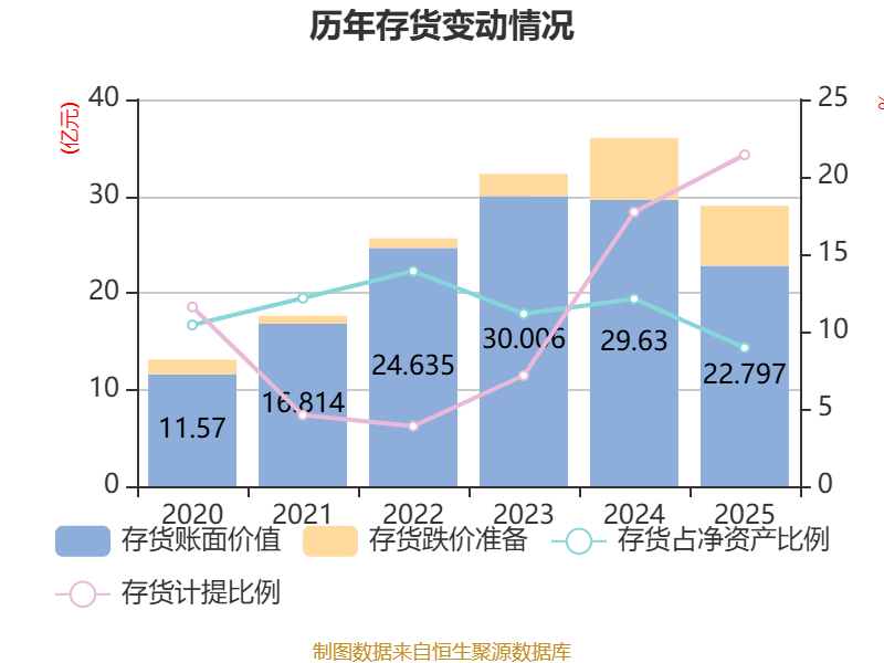 从存货变动来看,截至2025年末,公司存货账面价值为22.8亿元,占净资产的8.95%,较上年末减少6.83亿元。其中,存货跌价准备为6.21亿元,计提比例为21.42%。