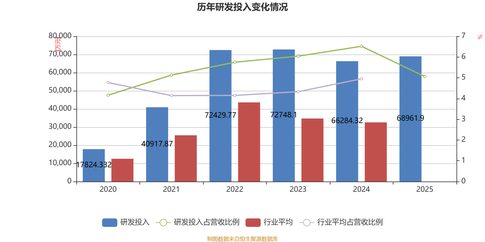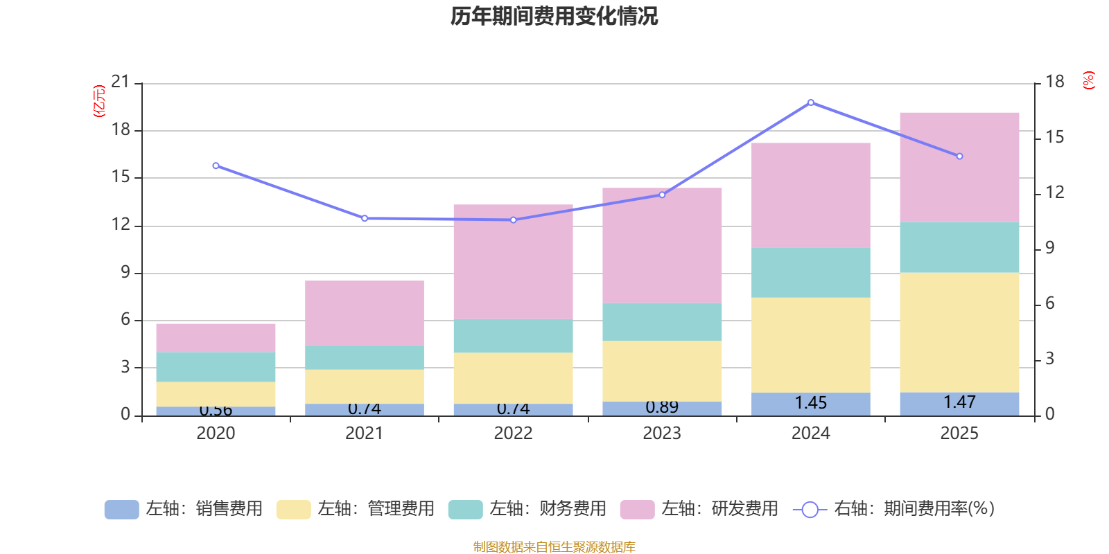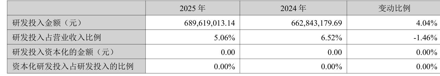 2025年全年,公司研发投入金额为6.9亿元,同比增长4.04%;研发投入占营业收入比例为5.06%,相比上年同期下降1.46个百分点。此外,公司全年研发投入资本化率为0%。