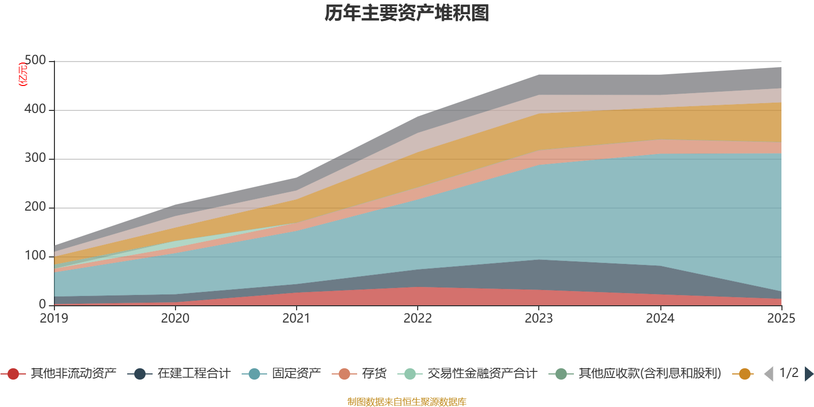 资产重大变化方面,截至2025年末,公司固定资产较上年末增加23.24%,占公司总资产比重上升9.39个百分点;在建工程合计较上年末减少73.9%,占公司总资产比重下降9.28个百分点;应收票据及应收账款较上年末增加25.38%,占公司总资产比重上升2.94个百分点;其他非流动资产较上年末减少40.6%,占公司总资产比重下降1.99个百分点。