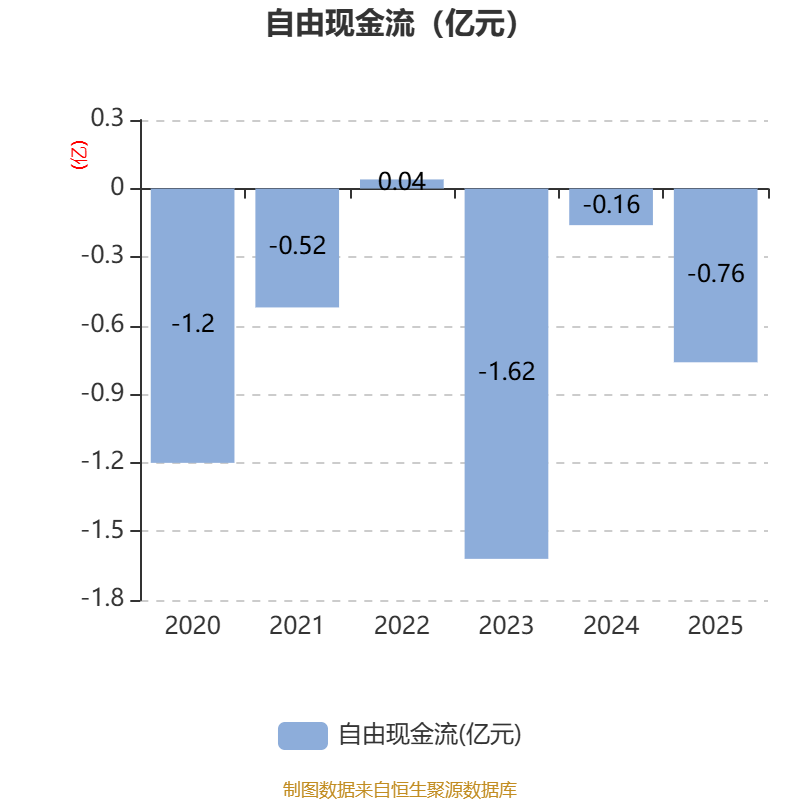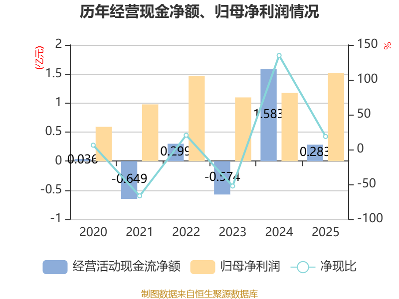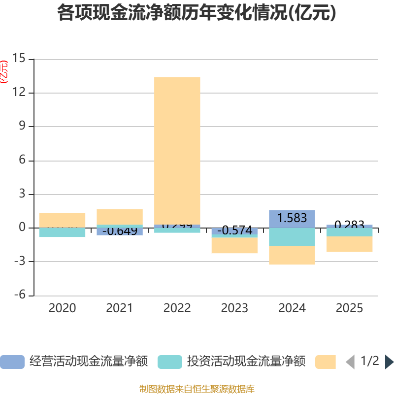 截至2025年,公司经营活动现金流净额为2832.42万元,同比下降82.11%;筹资活动现金流净额-1.38亿元,同比增加2880.71万元;投资活动现金流净额-7514.76万元,上年同期为-1.58亿元。