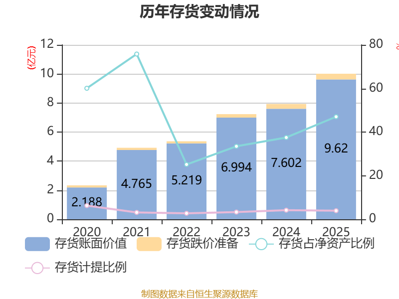 从存货变动来看,截至2025年末,公司存货账面价值为9.62亿元,占净资产的47.03%,较上年末增加2.02亿元。其中,存货跌价准备为3930.2万元,计提比例为3.93%。