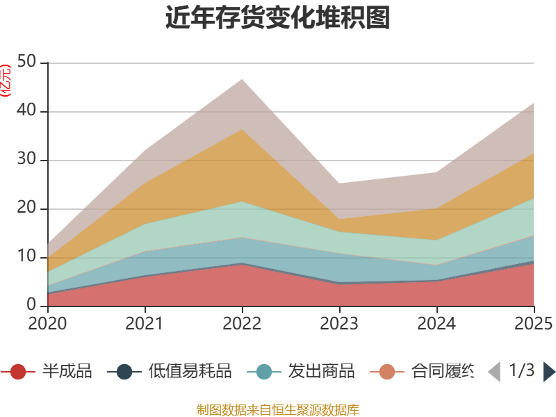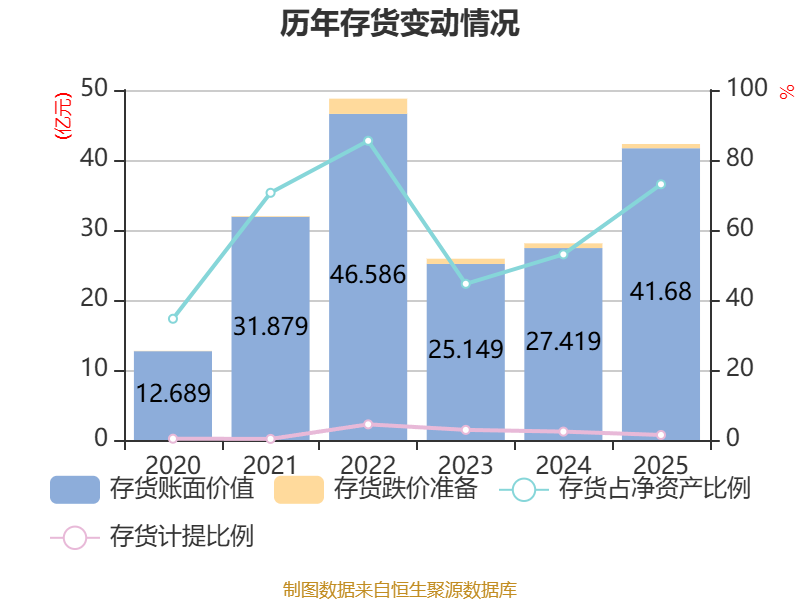 从存货变动来看,截至2025年末,公司存货账面价值为41.68亿元,占净资产的73.06%,较上年末增加14.26亿元。其中,存货跌价准备为6070.24万元,计提比例为1.44%。