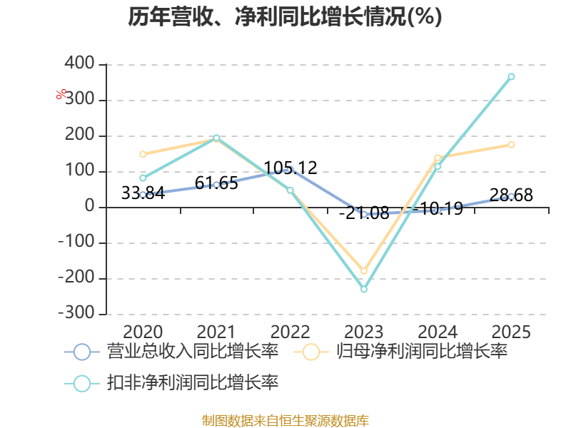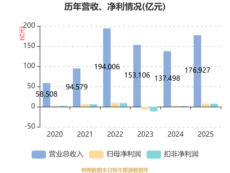 中证智能财讯索通发展(603612)4月23日披露2025年年度报告。2025年,公司实现营业总收入176.93亿元,同比增长28.68%;归母净利润7.47亿元,同比增长174.09%;扣非净利润7.37亿元,同比增长365.19%;经营活动产生的现金流量净额为7.12亿元,同比增长66.94%;报告期内,索通发展基本每股收益为1.51元,加权平均净资产收益率为13.73%。公司2025年度分配预案为:拟向全体股东每10股派现1.2元(含税)。