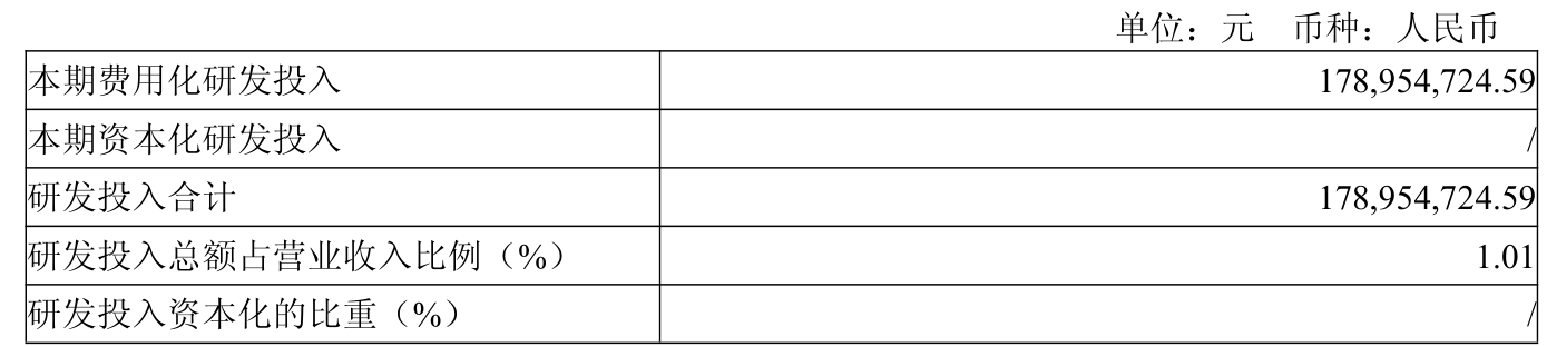 2025年全年,公司研发投入金额为1.79亿元,同比增长7.99%;研发投入占营业收入比例为1.01%,相比上年同期下降0.2个百分点。此外,公司全年研发投入资本化率为0%。