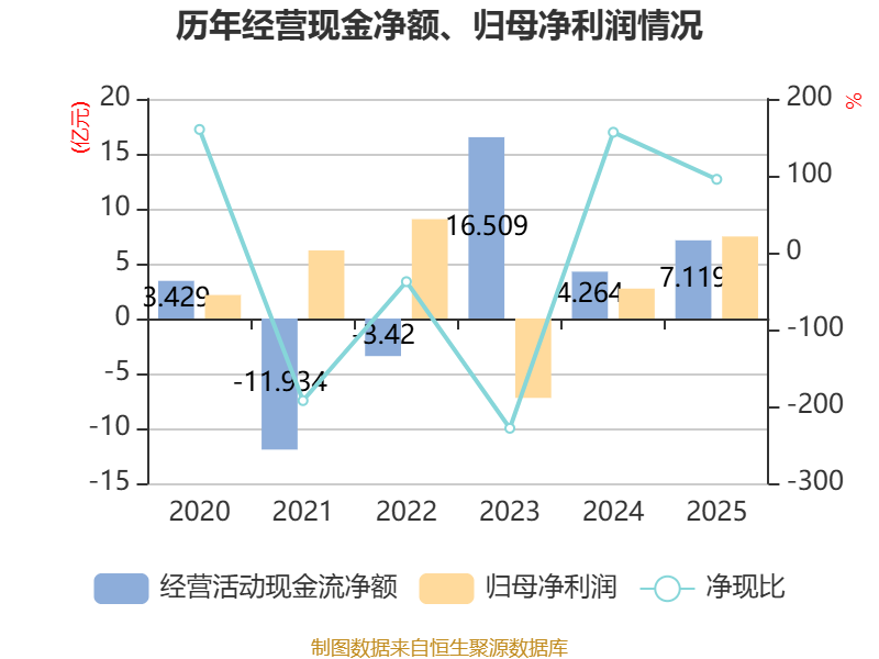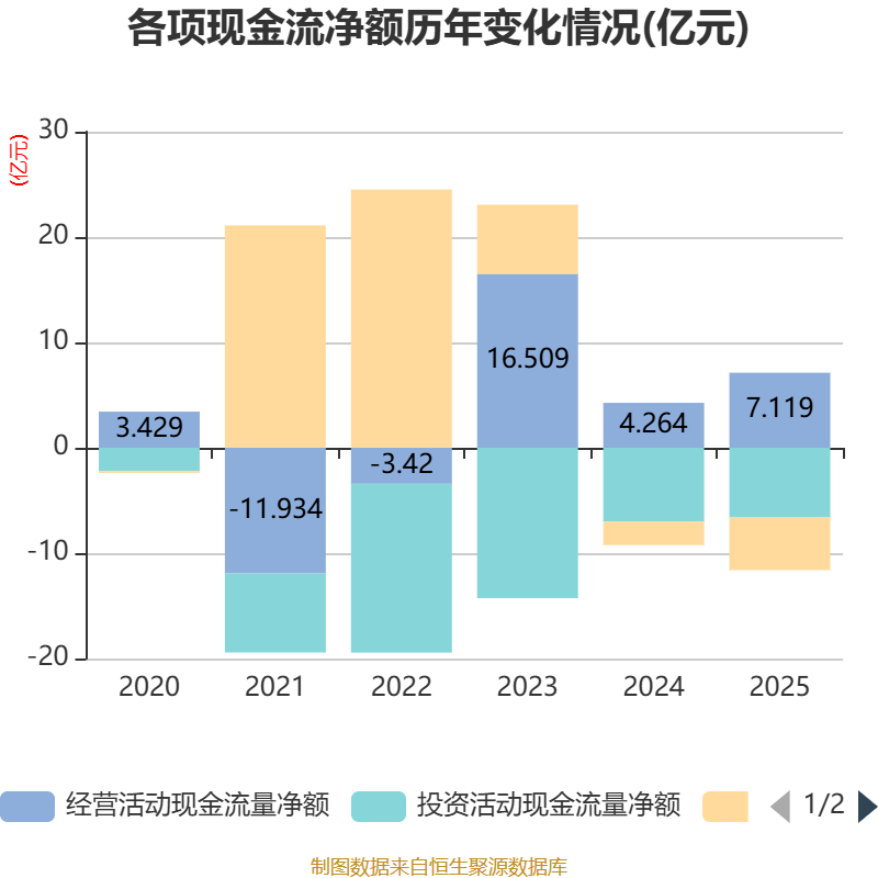 截至2025年,公司经营活动现金流净额为7.12亿元,同比增长66.94%;筹资活动现金流净额-4.98亿元,同比减少2.74亿元;投资活动现金流净额-6.62亿元,上年同期为-6.99亿元。
