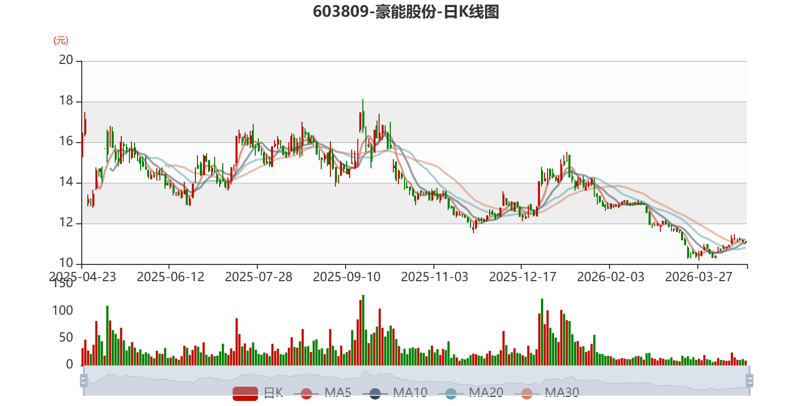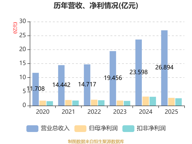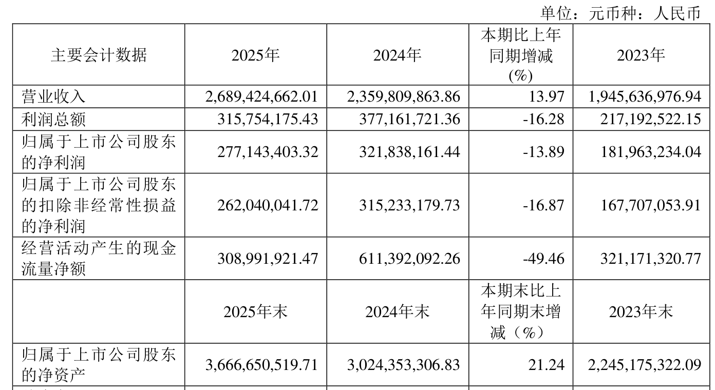 中证智能财讯豪能股份(603809)4月23日披露2025年年度报告。2025年,公司实现营业总收入26.89亿元,同比增长13.97%;归母净利润2.77亿元,同比下降13.89%;扣非净利润2.62亿元,同比下降16.87%;经营活动产生的现金流量净额为3.09亿元,同比下降49.46%;报告期内,豪能股份基本每股收益为0.3216元,加权平均净资产收益率为8.56%。公司2025年度分配预案为:拟向全体股东每10股派现1.5元(含税)。