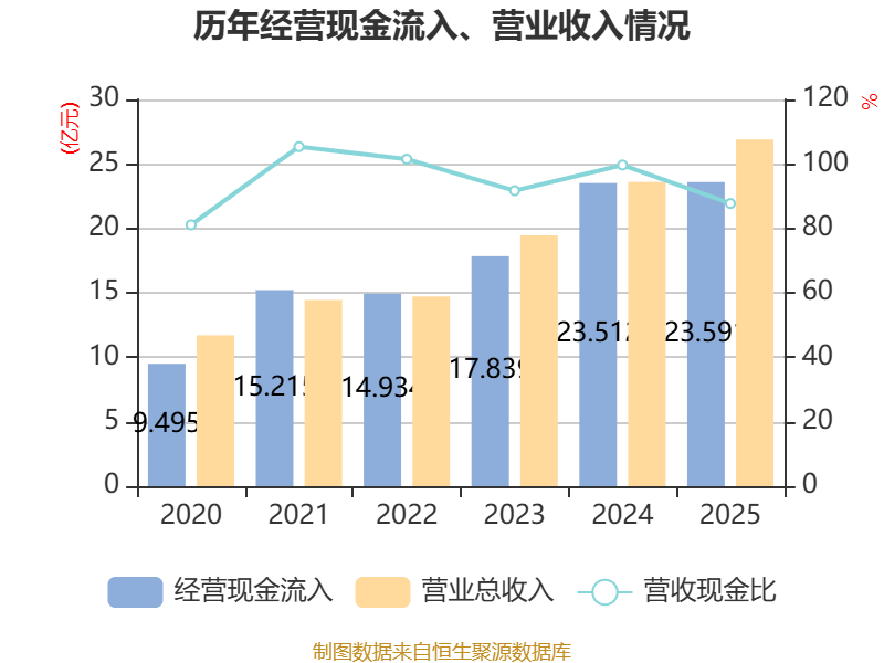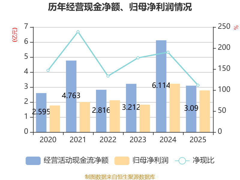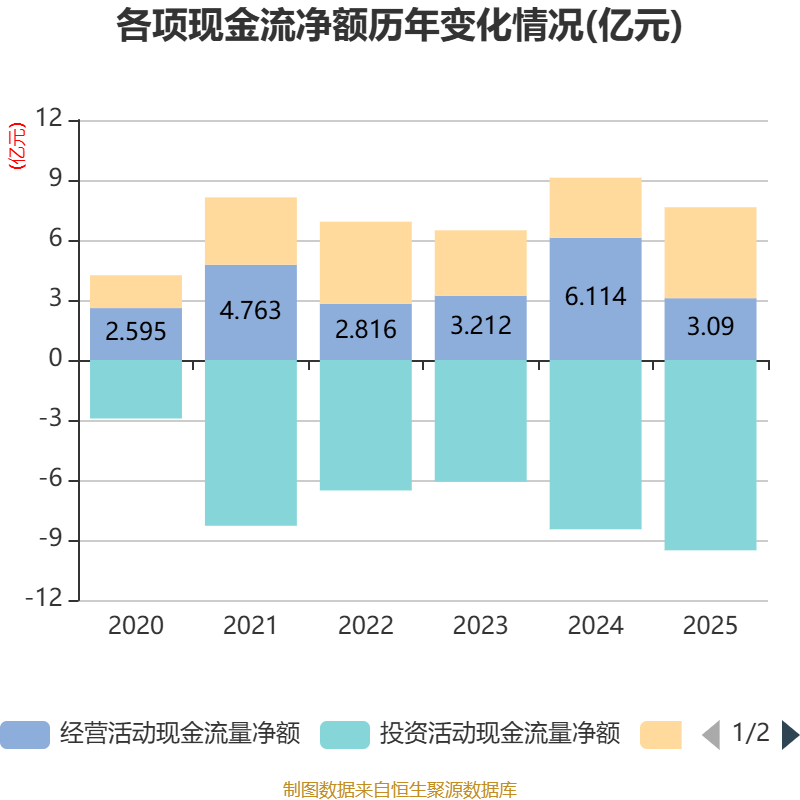 截至2025年,公司经营活动现金流净额为3.09亿元,同比下降49.46%;筹资活动现金流净额4.55亿元,同比增加1.55亿元;投资活动现金流净额-9.52亿元,上年同期为-8.47亿元。