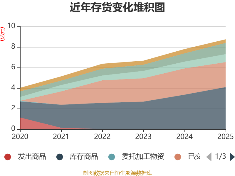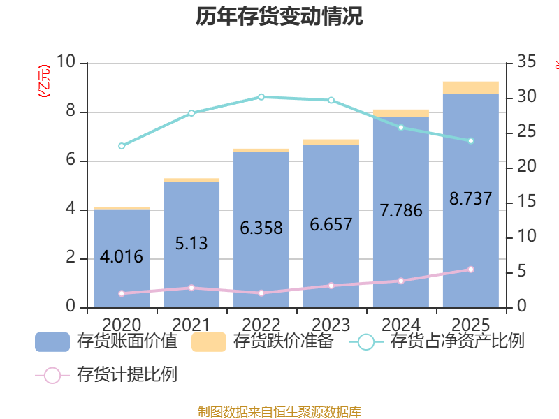 从存货变动来看,截至2025年末,公司存货账面价值为8.74亿元,占净资产的23.83%,较上年末增加9514.86万元。其中,存货跌价准备为5009.3万元,计提比例为5.42%。