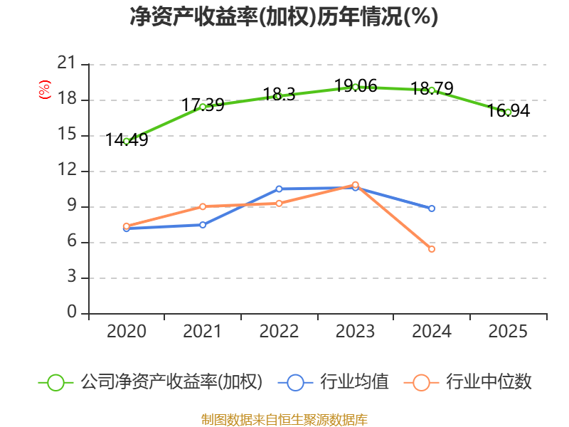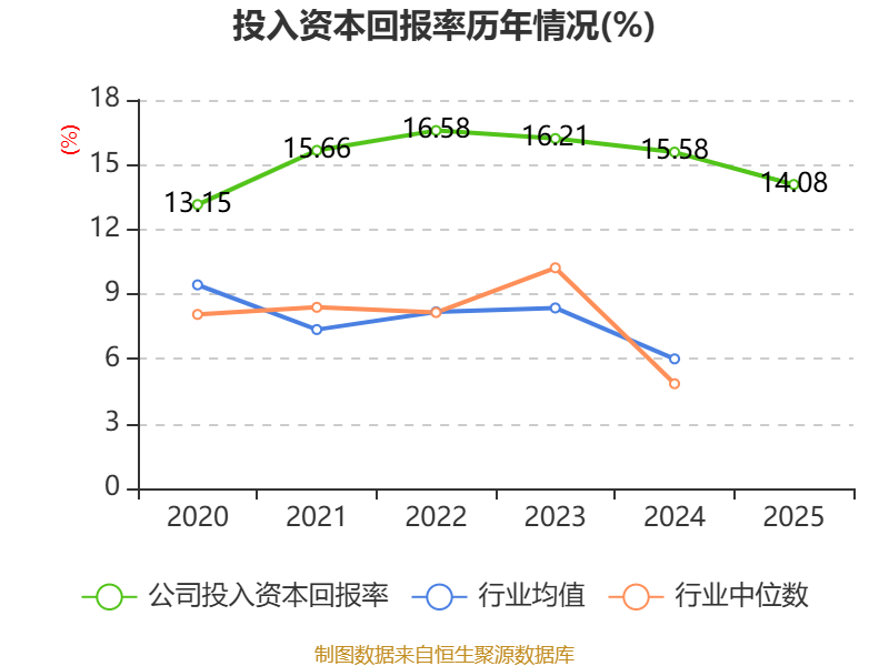 数据显示,2025年公司加权平均净资产收益率为16.94%,较上年同期下降1.85个百分点。公司2025年投入资本回报率为14.08%,较上年同期下降1.5个百分点。