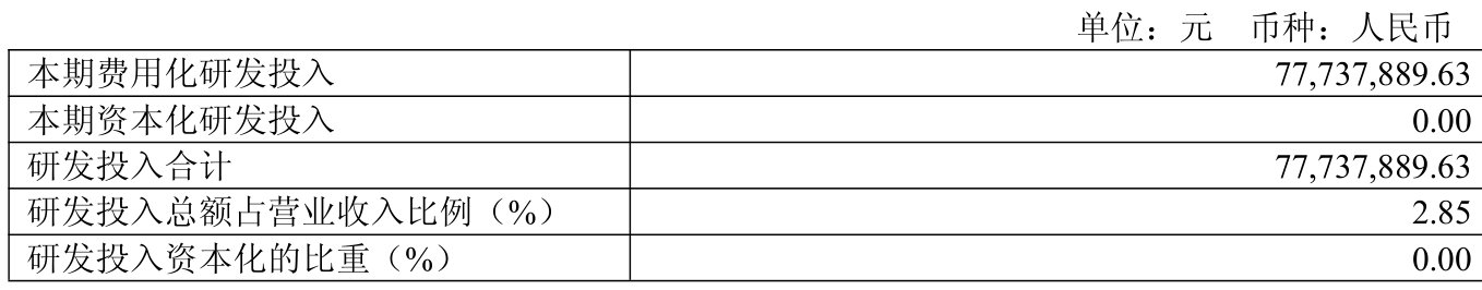 2025年全年,公司研发投入金额为7773.79万元;研发投入占营业收入比例为2.85%。此外,公司全年研发投入资本化率为0%。