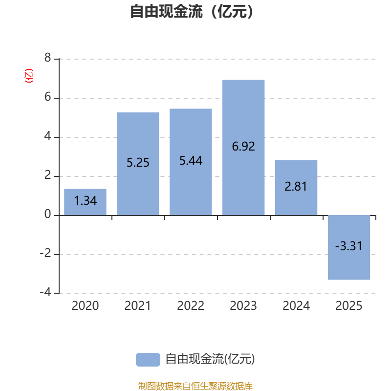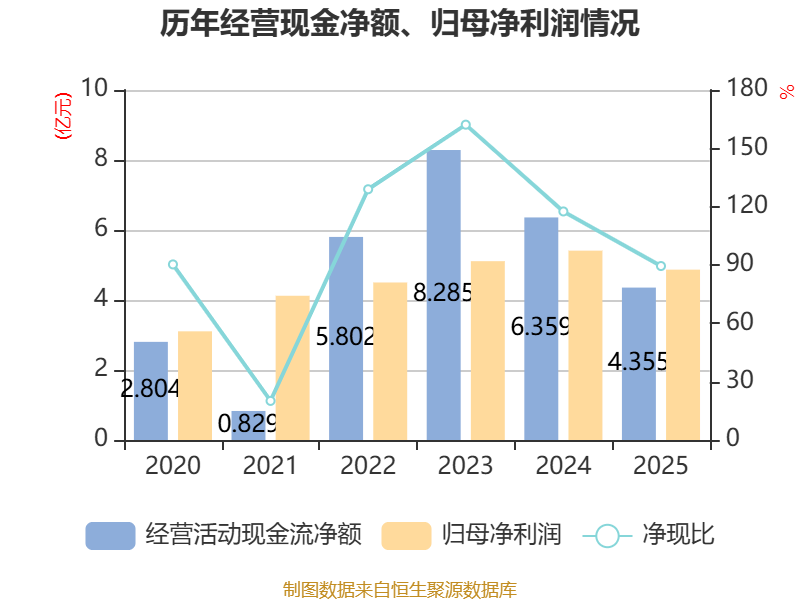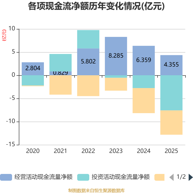 截至2025年,公司经营活动现金流净额为4.35亿元,同比下降31.52%;筹资活动现金流净额-5.25亿元,同比增加1663.01万元;投资活动现金流净额-7.59亿元,上年同期为-2.76亿元。