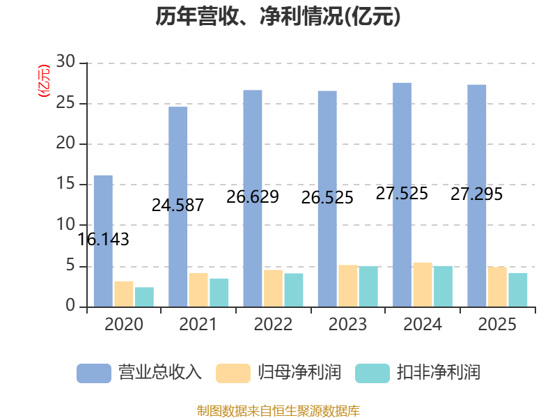 中证智能财讯银都股份(603277)4月23日披露2025年年度报告。2025年,公司实现营业总收入27.3亿元,同比下降0.84%;归母净利润4.87亿元,同比下降10.04%;扣非净利润4.12亿元,同比下降17.29%;经营活动产生的现金流量净额为4.35亿元,同比下降31.52%;报告期内,银都股份基本每股收益为0.8元,加权平均净资产收益率为16.94%。公司2025年度分配预案为:拟向全体股东每10股派现3.5元(含税)。