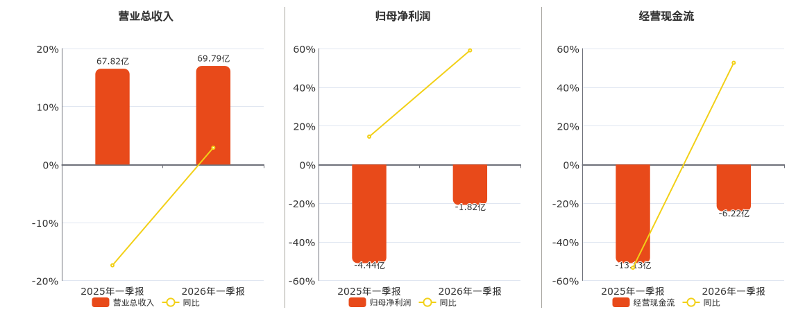 公司营业总收入为69.79亿元,较去年同报告期营业总收入增加1.97亿元,同比较去年同期上涨2.90%。归母净利润为-1.82亿元,较去年同报告期归母净利润增加2.62亿元,实现2年连续上涨。经营活动现金净流入为-6.22亿元,较去年同报告期经营活动现金净流入增加6.91亿元。